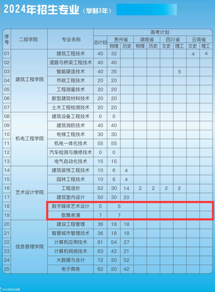 贵州建设职业技术学院2025年招生计划预计将于6月中下旬公布,本文为大家整理的是贵州建设职业技术学院2024年艺术类招生计划,主要包含招生专业、各专业招生人数等信息,希望对大家有所帮助,如有变动或异议,请以各省市教育考试院或学校公布的信息为准。