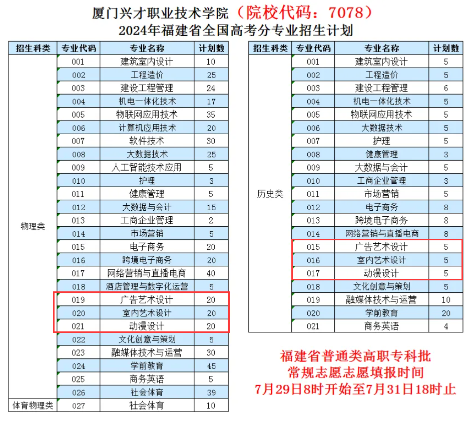 厦门兴才职业技术学院2025年招生计划预计将于6月中下旬公布,本文为大家整理的是厦门兴才职业技术学院2024年艺术类招生计划,主要包含招生专业、各专业招生人数等信息,希望对大家有所帮助,如有变动或异议,请以各省市教育考试院或学校公布的信息为准。