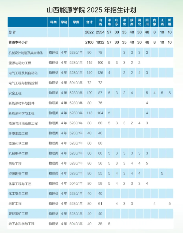 本文为大家整理的是山西能源学院2025年招生计划,主要包含招生专业、招生类别、各专业招生人数等信息,希望对大家有所帮助,如有变动或异议,请以各省市教育考试院或学校公布的信息为准。