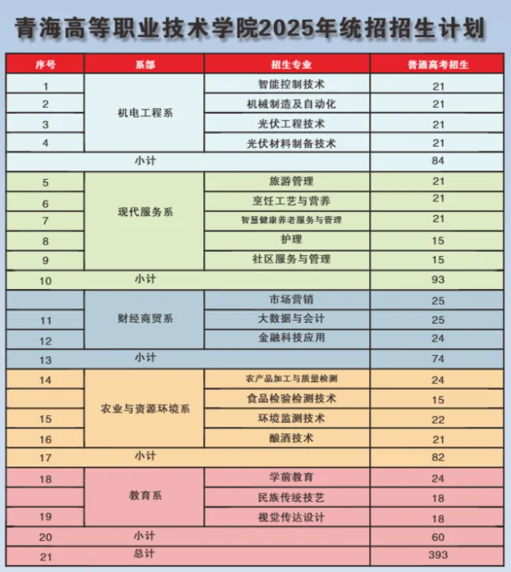 本文为大家整理的是青海高等职业技术学院2025年招生计划,主要包含招生专业、招生类别、各专业招生人数等信息,希望对大家有所帮助,如有变动或异议,请以各省市教育考试院或学校公布的信息为准。