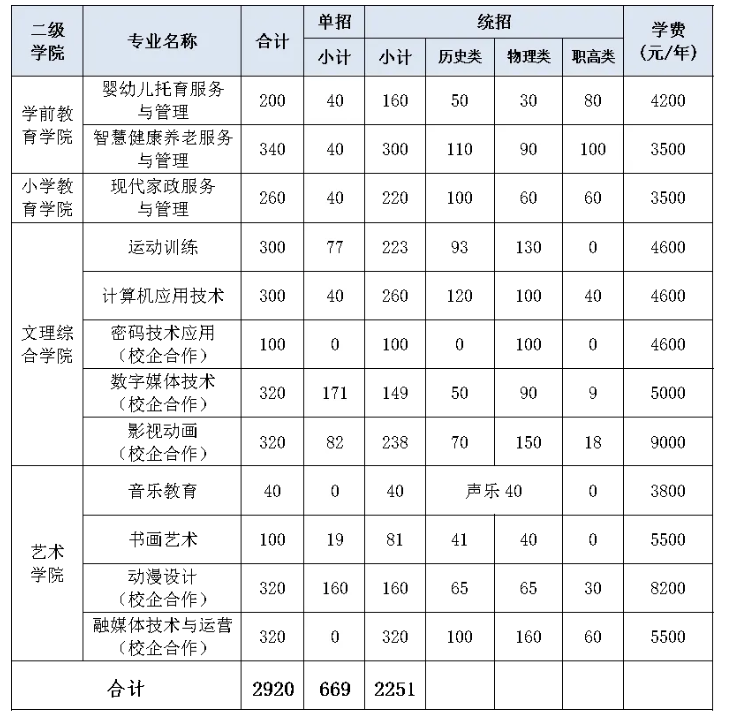 2025年我校招生计划2920人(含单独招生已录取的669人),12个专业,具体招生专业、类别及计划如下: