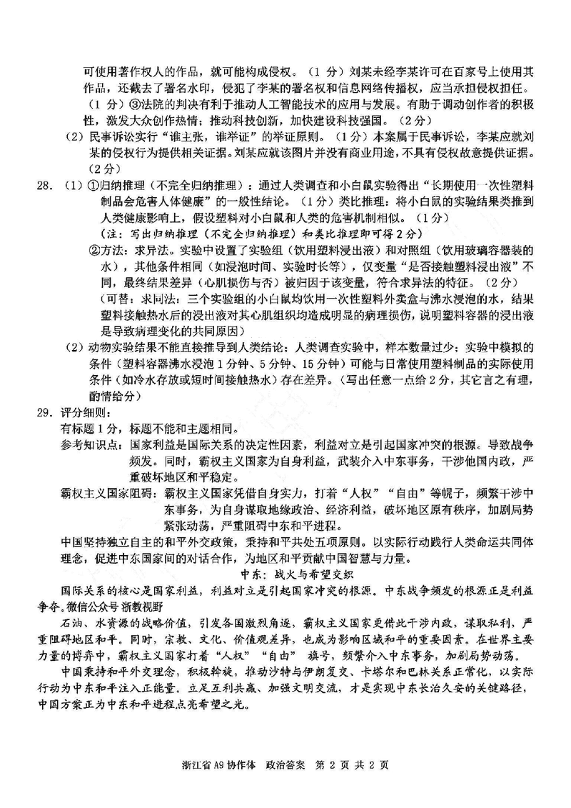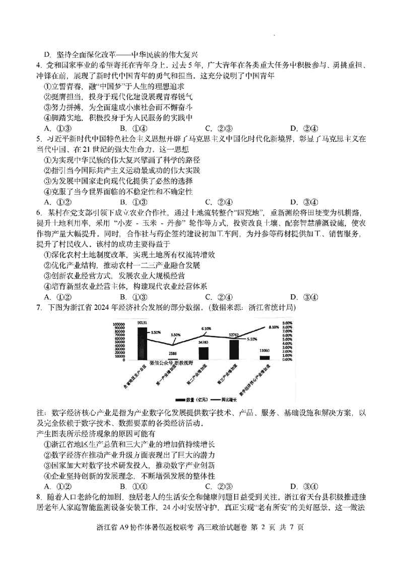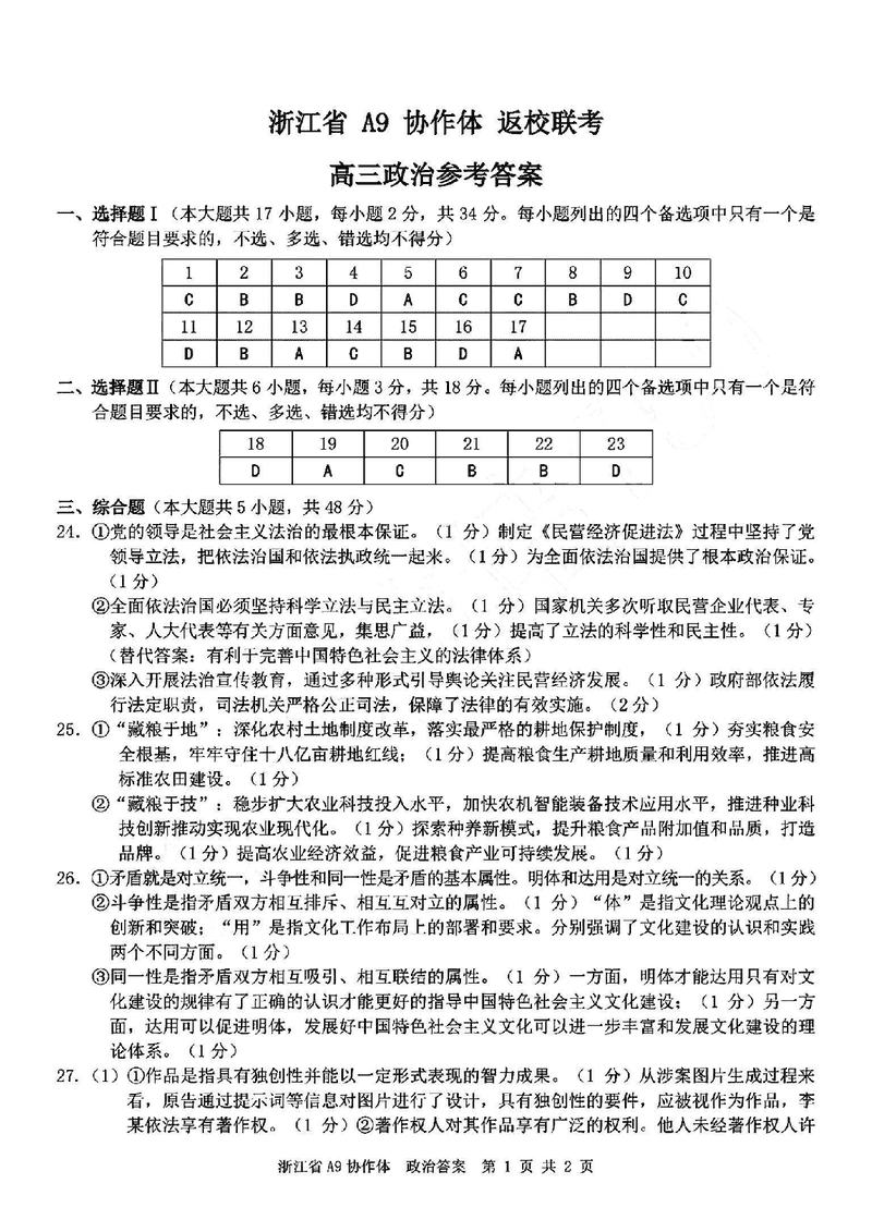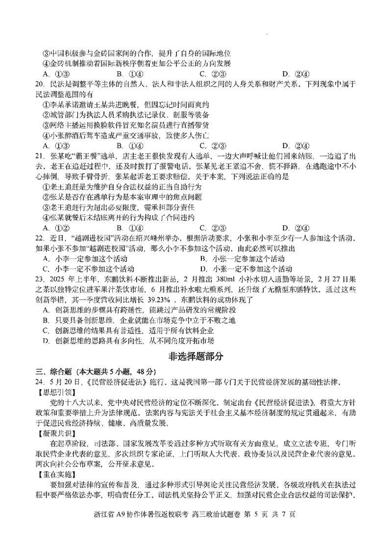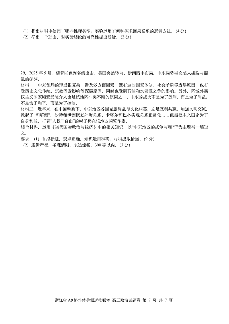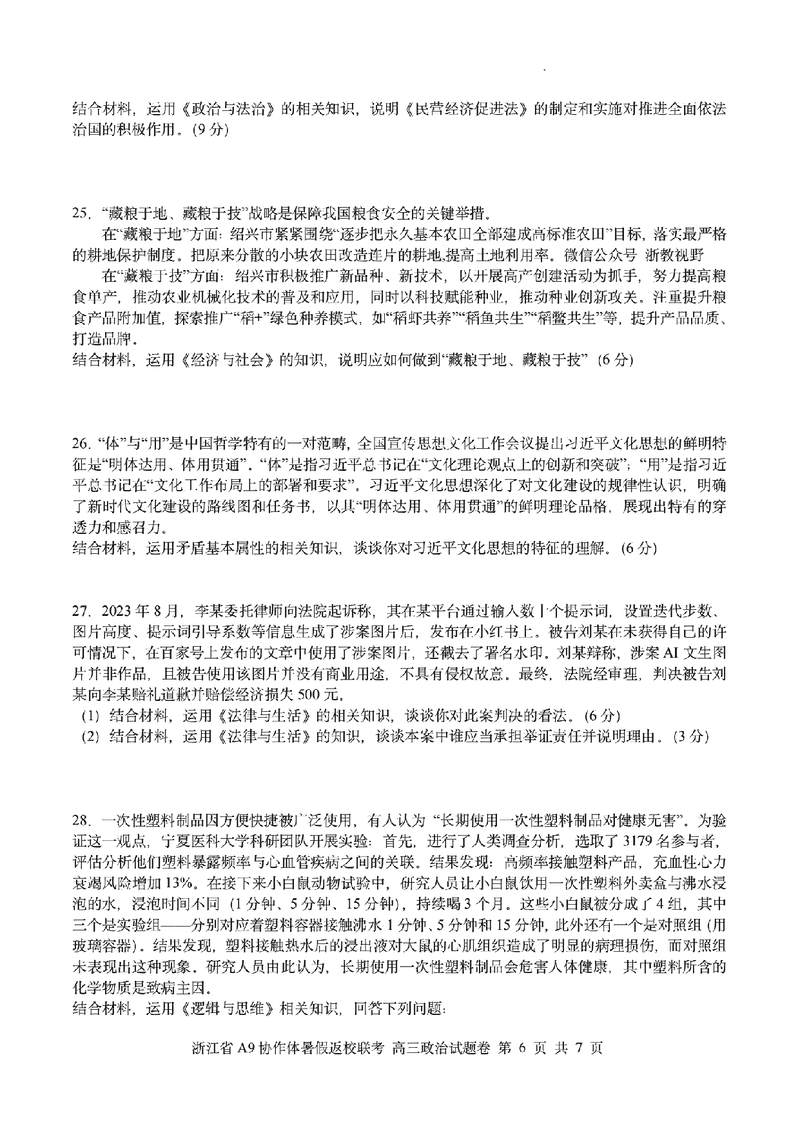 浙江A9协作体2026届高三暑假返校联考政治试卷及参考答案