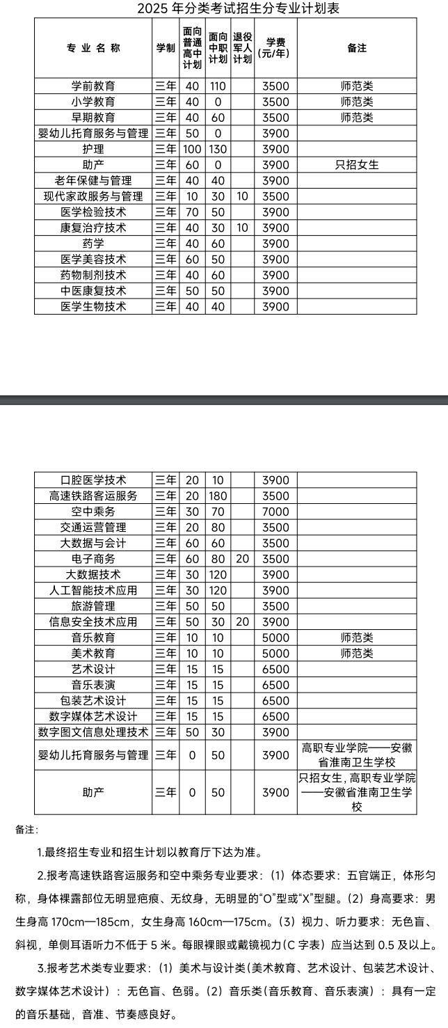 2025年我校分类考试招生总计划3000 名, 其中面向普通高中计划 1220名,面向中职计划1720名,面向退役军人专项计划60 名,各专业均 不限历史和物理科目, 统一录取。