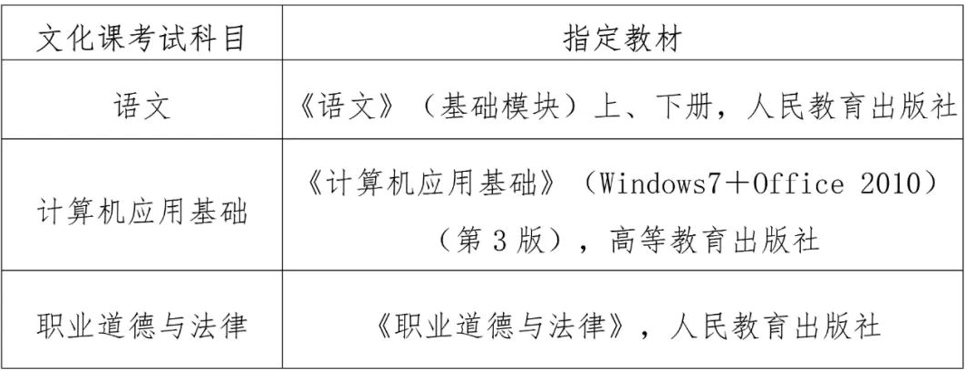 1.文化课考试方式。文化课采取笔试的考试方式,实行全省统一命题、统一考试、统一评卷,由省考试局负责组织实施。考试内容为我省中职学校所开设课程的基本知识,各科指定教材详见下表: