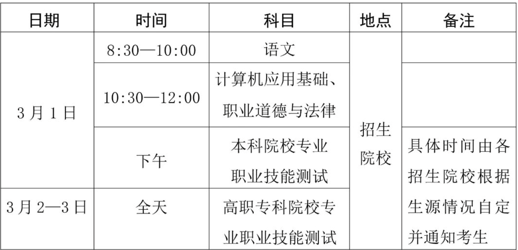 语文科目满分100分,考试时间为90分钟。计算机应用基础、职业道德与法律两个科目采取合场、合卷的考试办法,两科卷面满分为100分,各占50分,考试时间共为90分钟。