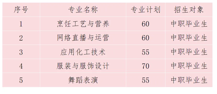 第十一条 2025年学校设置高职单独招生专业5个,总计划300人,具体分专业计划等情况详见下表。