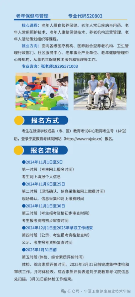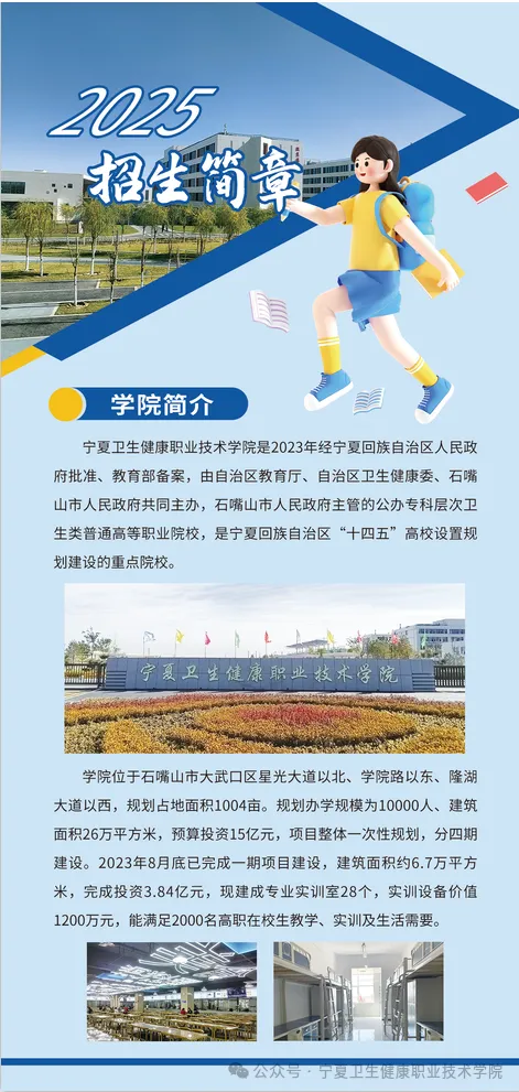 本文为大家整理的是2025年宁夏卫生健康职业技术学院分类考试招生简章,主要包含学校概况、招生专业、招生计划、收费标准、录取规则等信息,以下是详细内容,供大家参考。