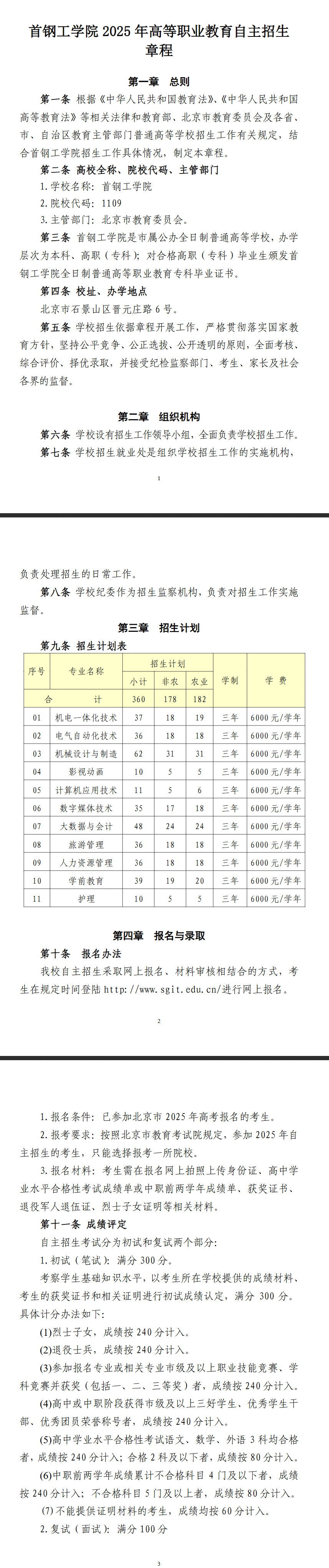 2025年首钢工学院高职自主招生章程 时间:2025-06-05 高职单招 本文为大家整理的是2025年首钢工学院高职自主招生章程,主要包含学校概况、招生专业、招生计划、收费标准、录取规则等信息,以下是详细内容,供大家参考。首钢工学院2025年高等职业教育自主招生章程