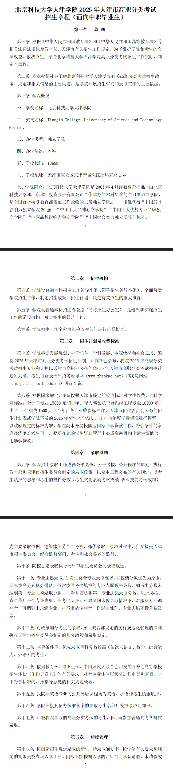 2025年北京科技大学天津学院高职分类考试招生章程 时间:2025-06-05 高职单招 点击查看完整版:http://www.zhaokao.net/zkzx/system/2025/04/12/030008486.shtml