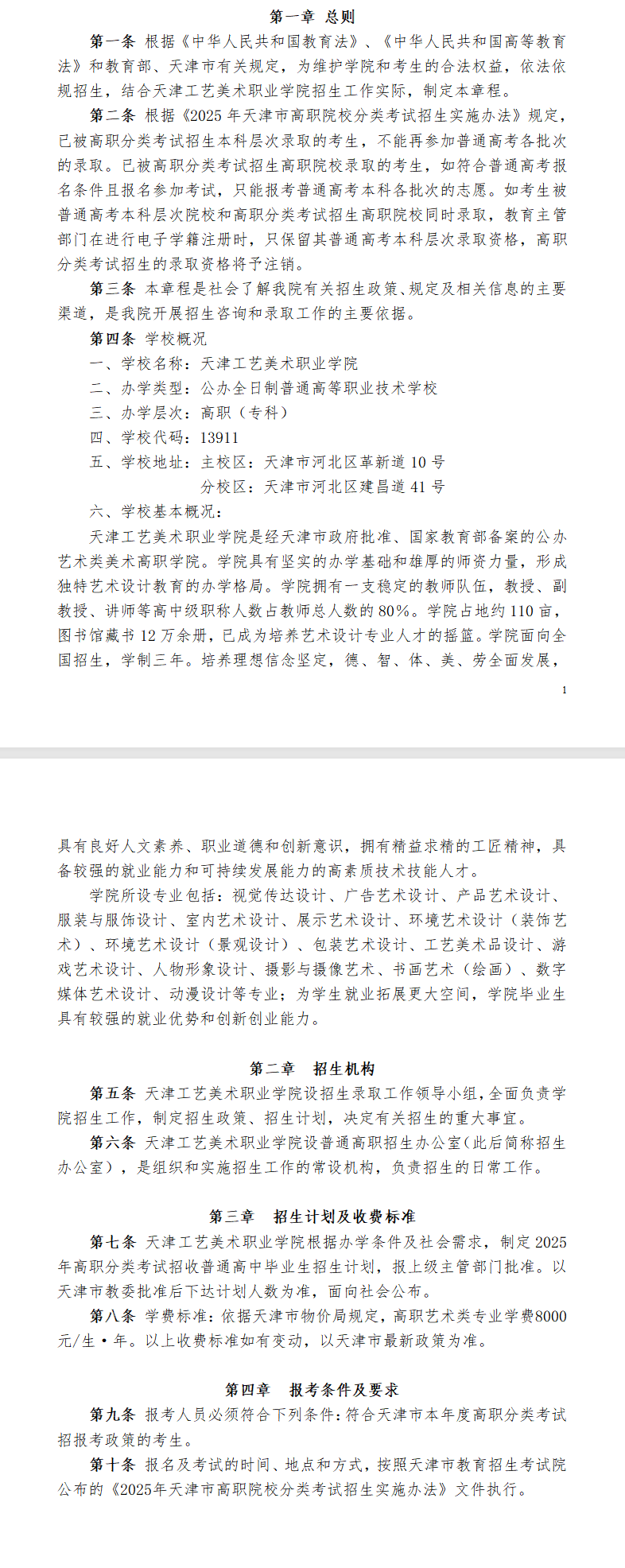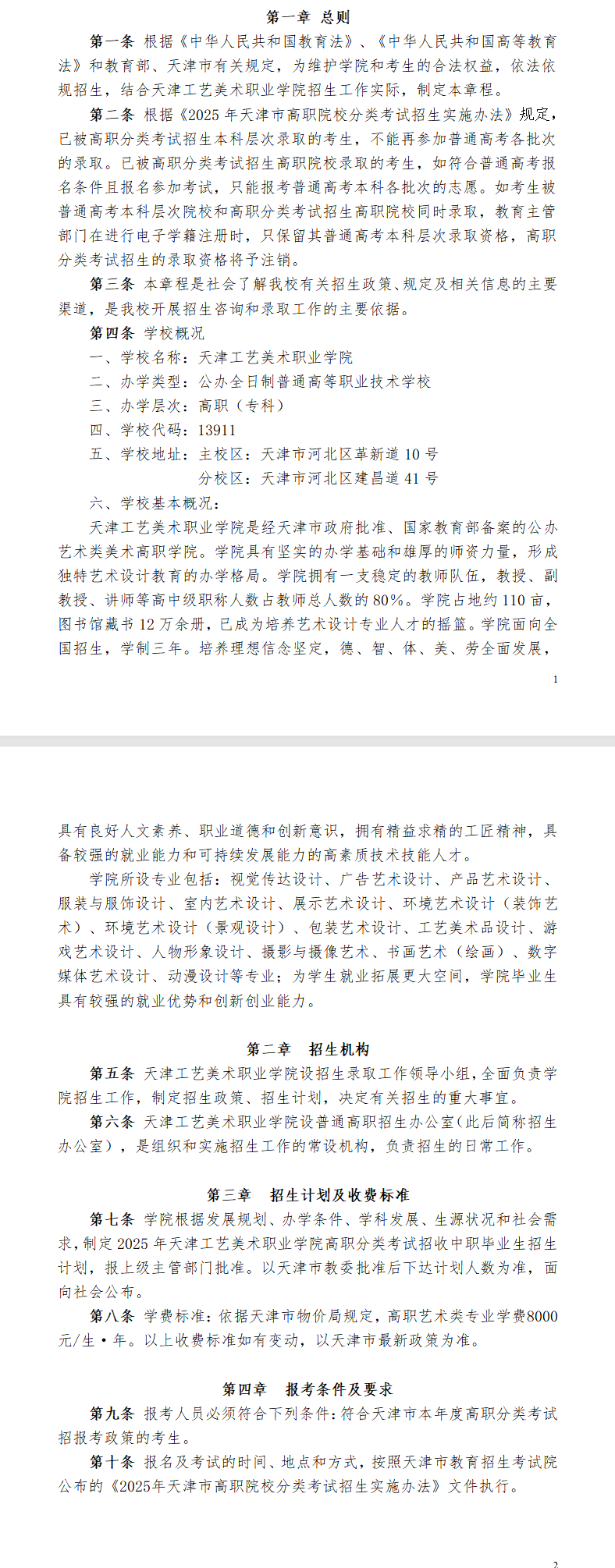 本文为大家整理的是2025天津工艺美术职业学院高职分类考试招生章程,主要包含学校概况、招生专业、招生计划、收费标准、录取规则等信息,以下是详细内容,供大家参考。