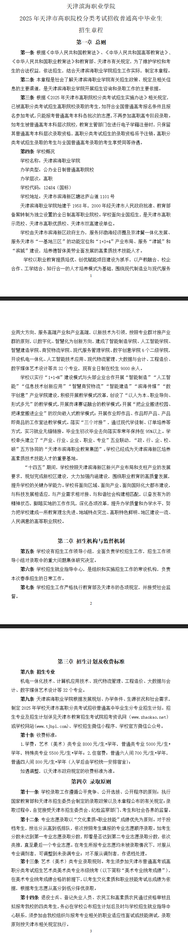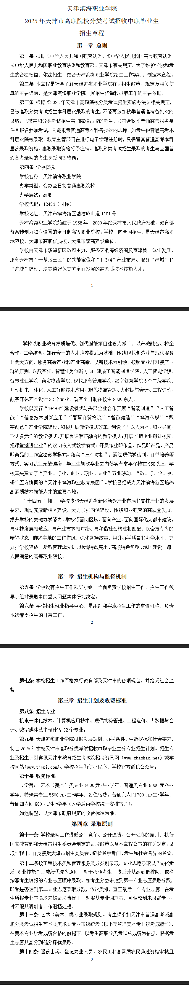 本文为大家整理的是2025年天津滨海职业学院高职分类考试招生章程,主要包含学校概况、招生专业、招生计划、收费标准、录取规则等信息,以下是详细内容,供大家参考。