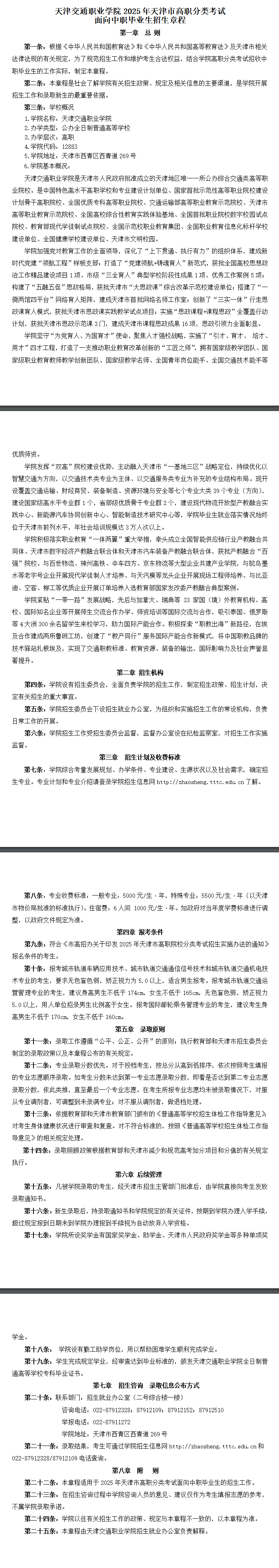 本文为大家整理的是2025年天津交通职业学院高职分类考试招生章程,主要包含学校概况、招生专业、招生计划、收费标准、录取规则等信息,以下是详细内容,供大家参考。