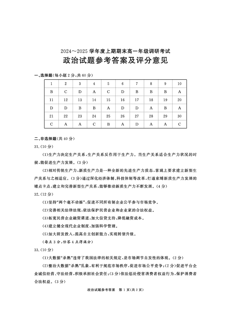 四川成都2025年高一上期期末统一调研政治试卷及参考答案