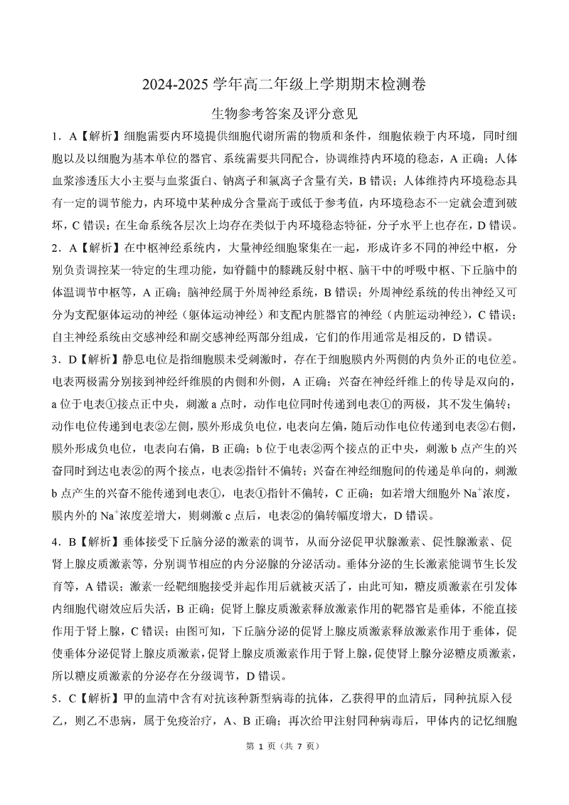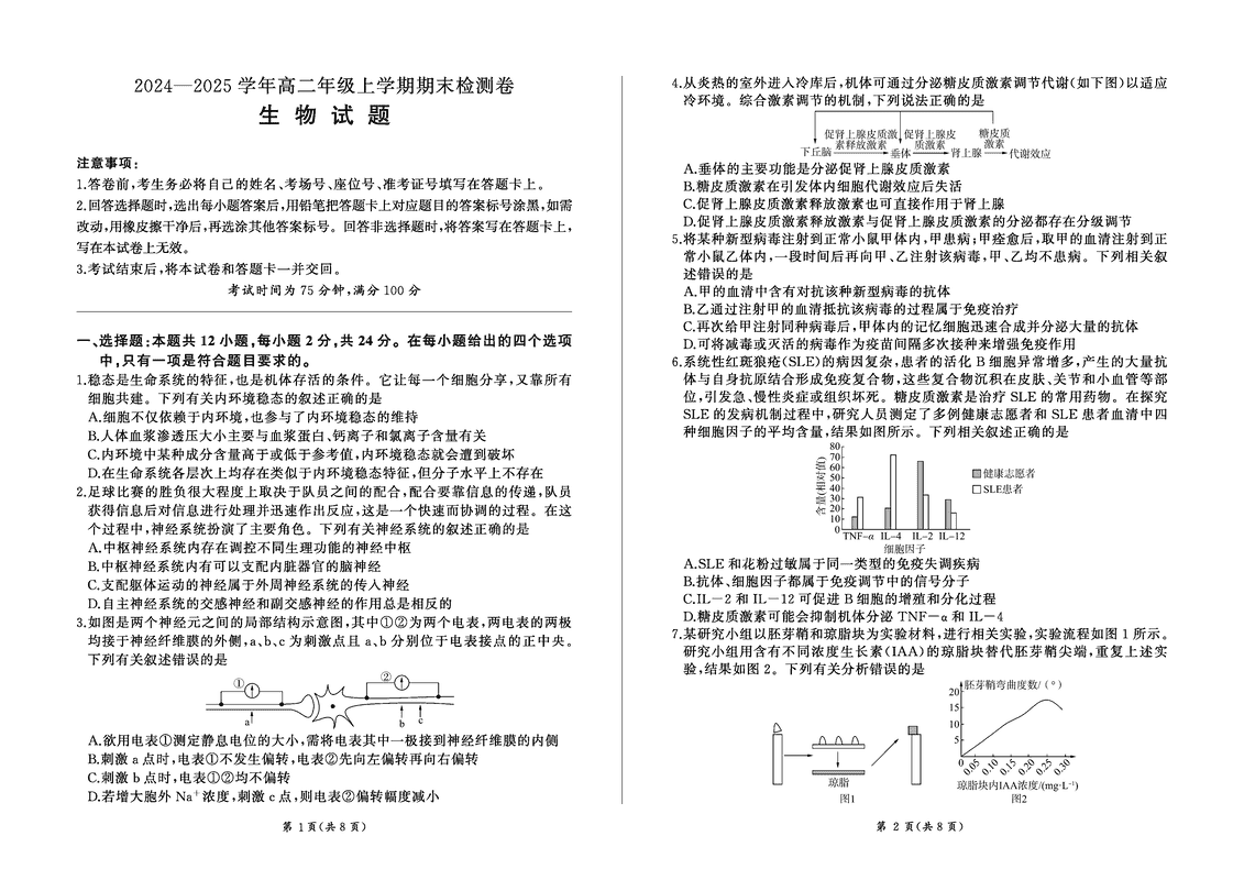 湖南百师联盟2024-2025学年高二上学期1月期末联考生物试卷及参考答案