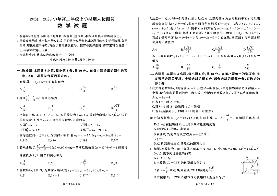 湖南百师联盟2024-2025学年高二上学期1月期末联考数学试卷及参考答案