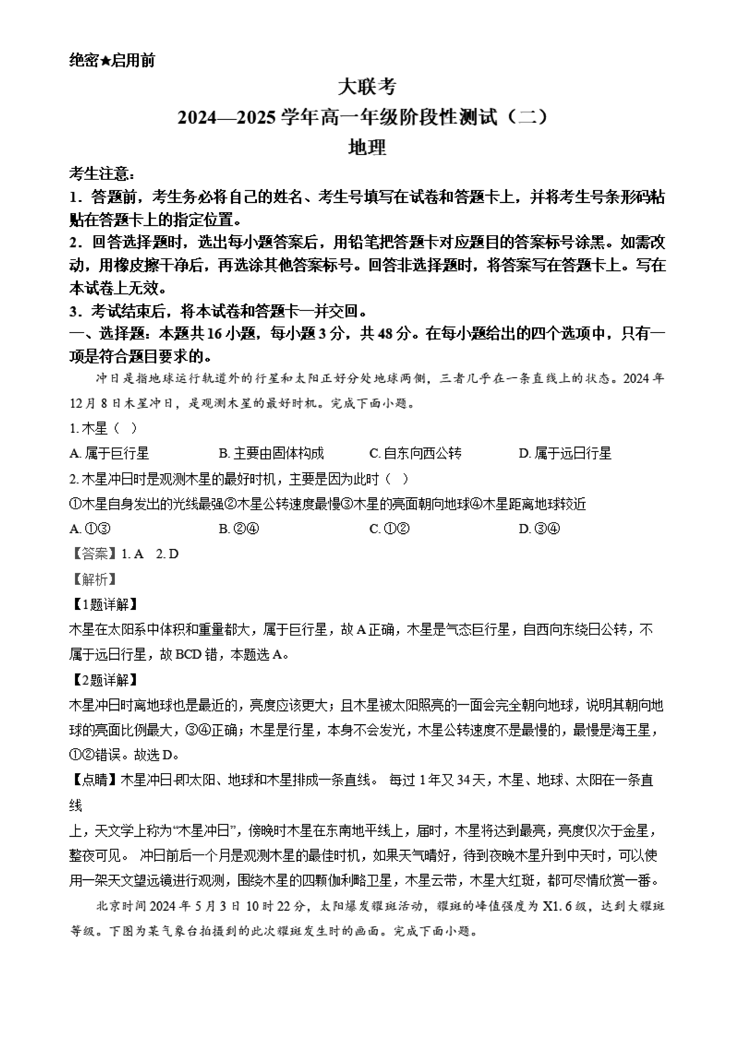 河南名校大联考2024-2025学年高一上学期12月月考地理试题质量较高,题型多样,将作为考察考生对相应考点的掌握程度,考后将及时整理试题及答案解析相关信息,以供考生学习交流!