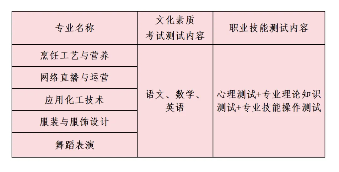 第十四条 此次高职单招招生考试采取“文化素质+职业技能测试”的模式,考试时间为3月30日(其中文化素质测试时间为9:00-11:00,职业技能测试时间为14:00-17:00)。各专业考试方式具体见下表。
