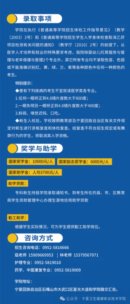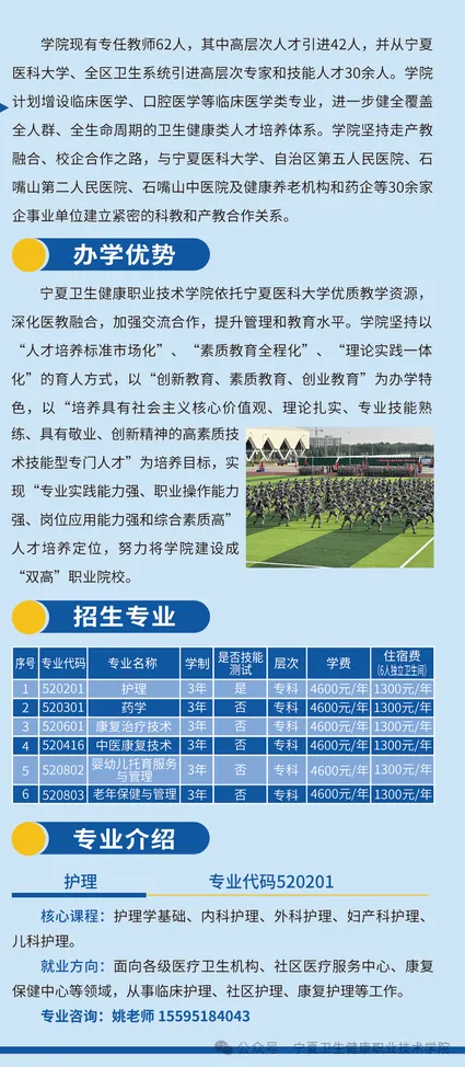 本文为大家整理的是2025年宁夏卫生健康职业技术学院分类考试招生简章,主要包含学校概况、招生专业、招生计划、收费标准、录取规则等信息,以下是详细内容,供大家参考。