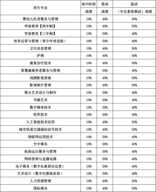 自主招生总评成绩由笔试成绩、面试成绩、高中(中职)阶段的学习成绩构成,各单项成绩为100分,按考生报考的不同专业,各项成绩的权重比例如下: