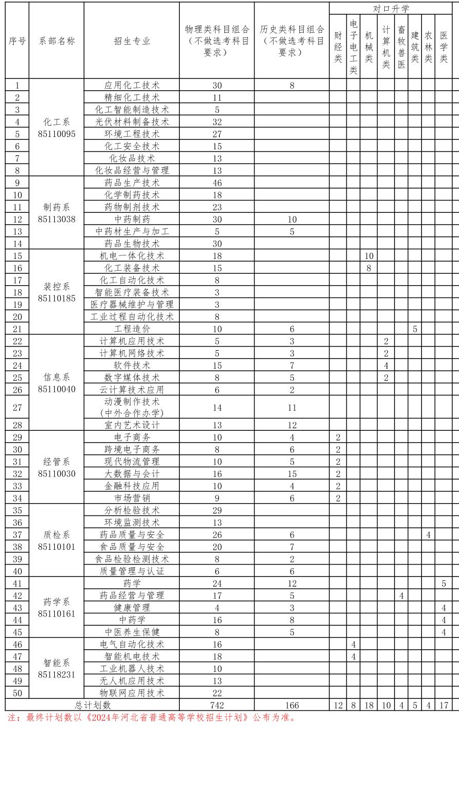 河北化工医药职业技术学院2025年招生计划预计将于6月中下旬公布,本文为大家整理的是河北化工医药职业技术学院2024年招生计划,主要包含招生专业、招生类别、各专业招生人数等信息,希望对大家有所帮助,如有变动或异议,请以各省市教育考试院或学校公布的信息为准。