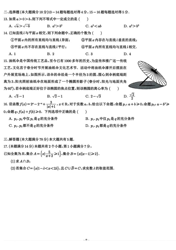 泸州一诊高2025届第一次教学质量诊断数学试卷及参考答案