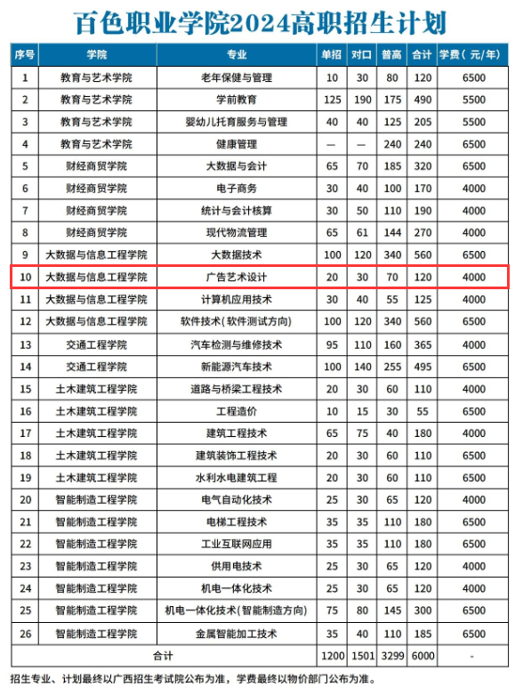 百色职业学院艺术类招生计划-各专业招生人数是多少