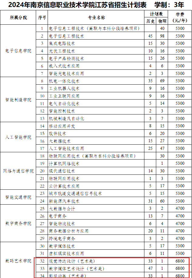 南京信息职业技术学院艺术类招生计划-各专业招生人数是多少