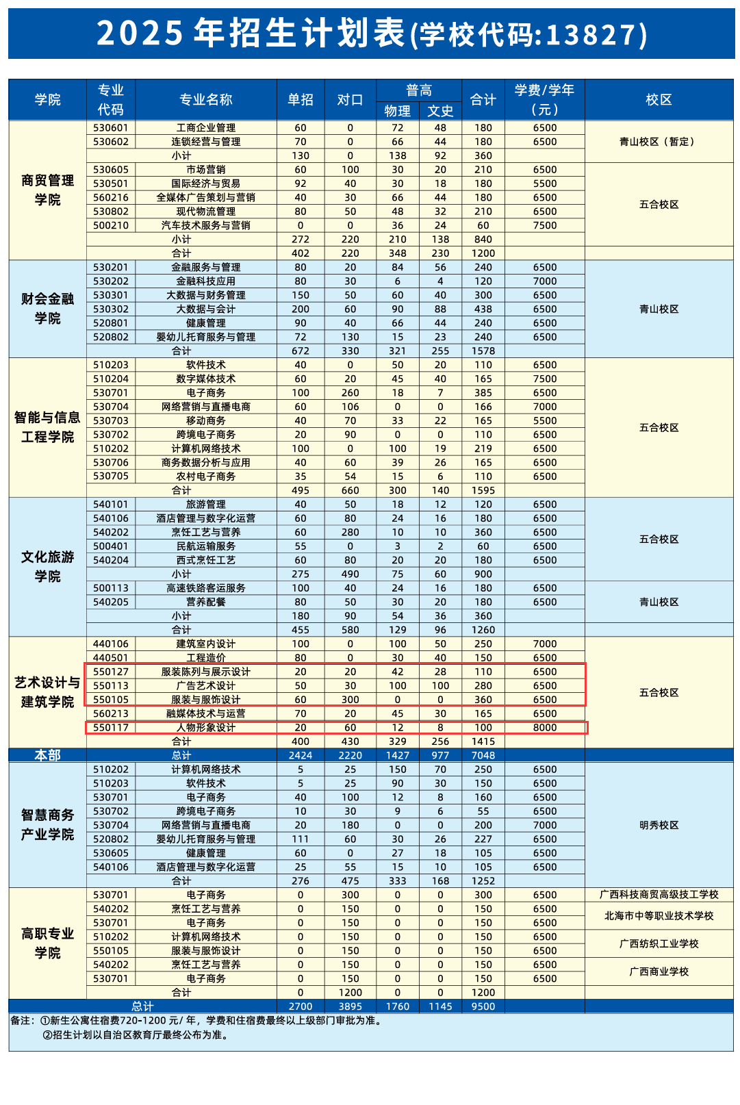 本文为大家整理的是广西经贸职业技术学院2025年艺术类招生计划,主要包含招生专业、各专业招生人数等信息,希望对大家有所帮助,如有变动或异议,请以各省市教育考试院或学校公布的信息为准。